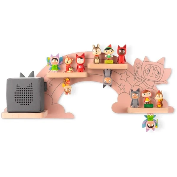 Das Tonie Regal „Hinter dem Regenbogen“ in der Farbe Feenrosa ist die perfekte Bühne für die Tonie-Sammlung. Dabei ist es viel mehr als ein dekoratives Wandregal: Es ist eine moderne Bibliothek, die entworfen wurde, um die Lieblings-Tonies, die Toniebox und ihre Ladestation unterzubringen. Auf dem feenrosa Regenbogen erstrahlt das Fantasiereich des Hör-Spiel-Spaß in vollem Glanz. Süße Motive aus der Tonie-Welt machen den bezaubernden Blickfang zum einzigartigen Hingucker in jedem Kinderzimmer. Bis zu 20 Tonies stehen oder hängen sicher auf den magnetischen Holzflächen. Die Toniebox hat ihren eigenen Platz mit Öffnung und Vertiefung für ihre Ladestation. Das Regal lässt sich schnell und einfach an der Wand montieren, die passenden Schrauben und Dübel sind dabei.Art.-Nr.: 1918273